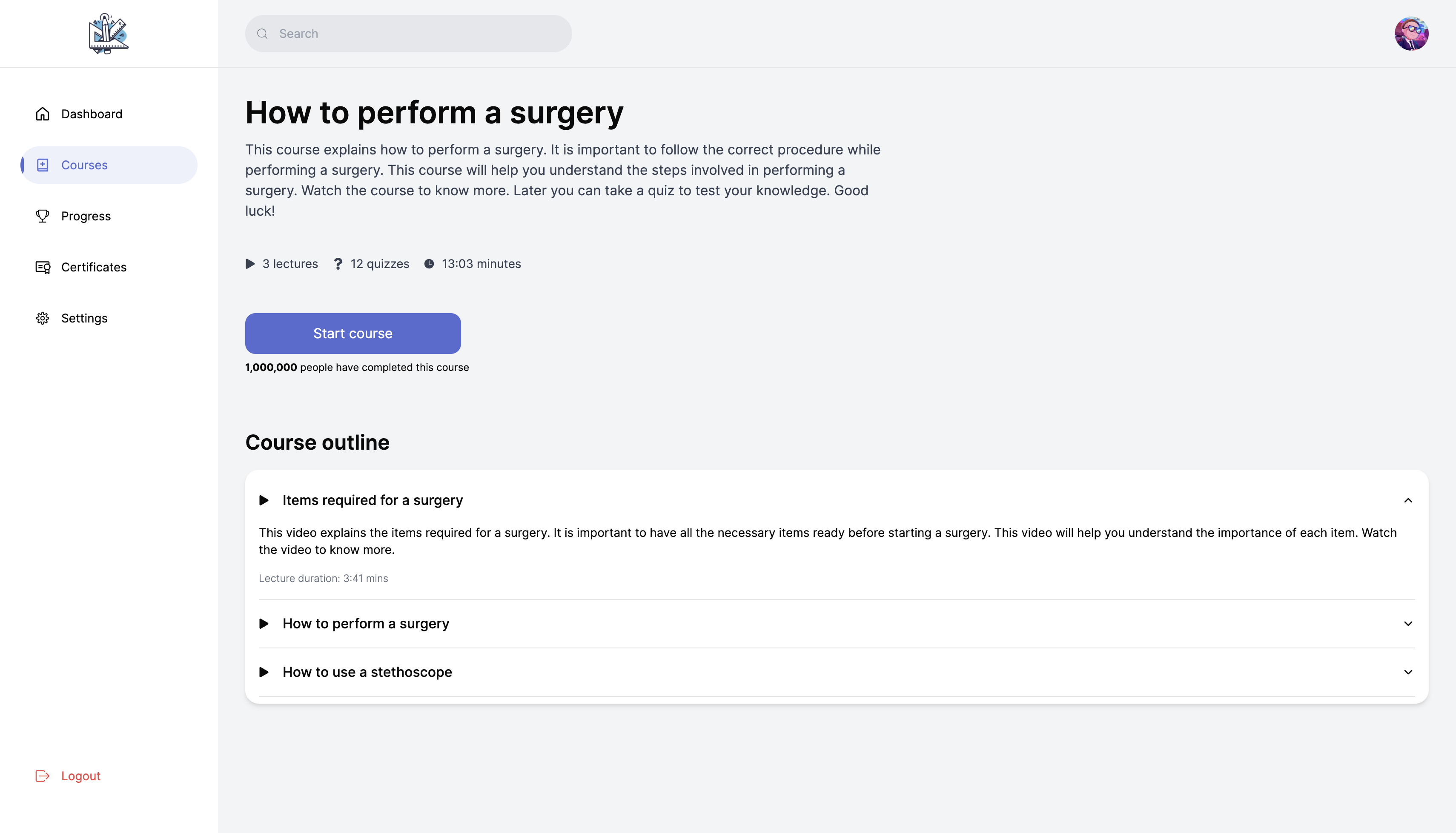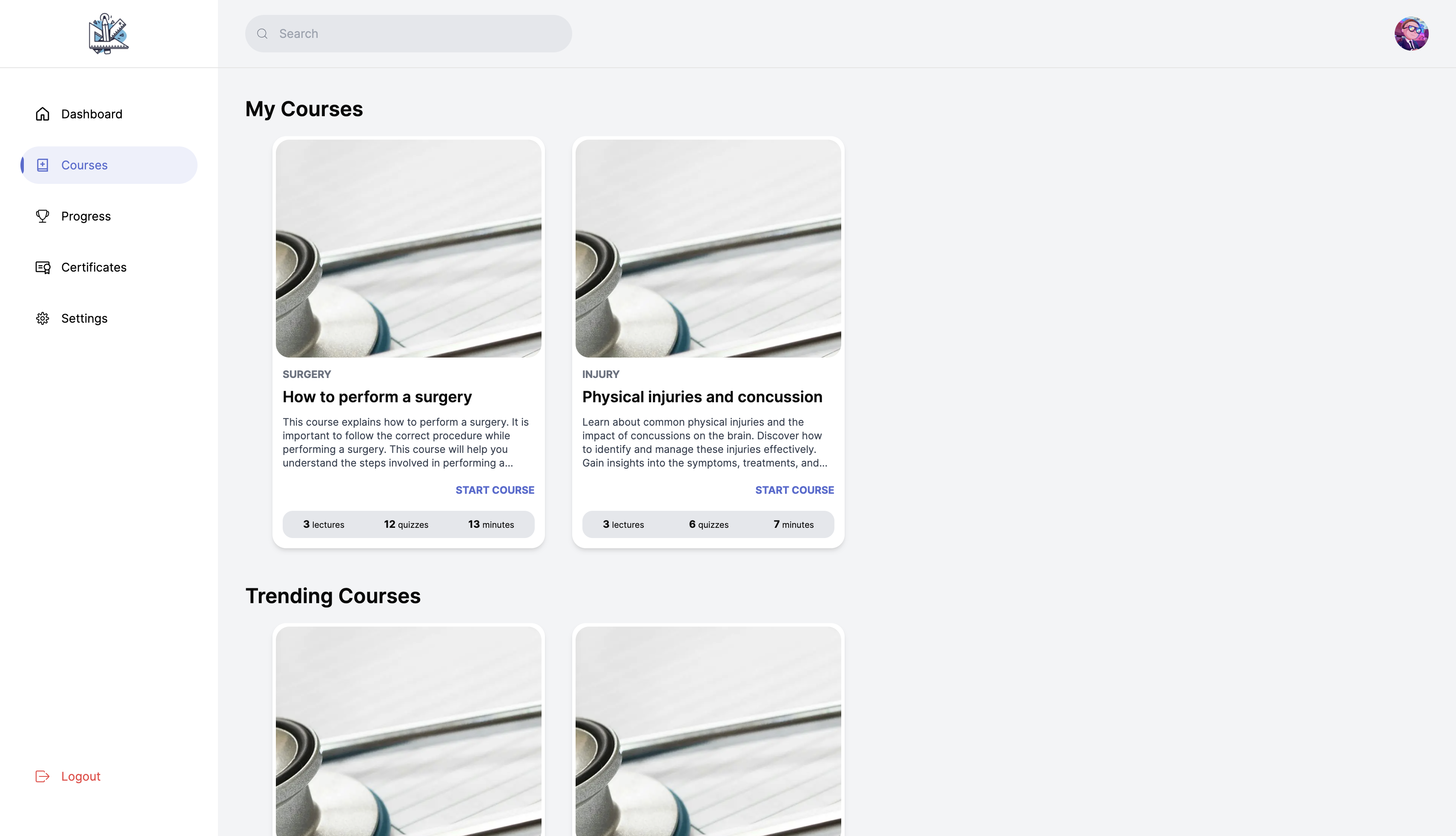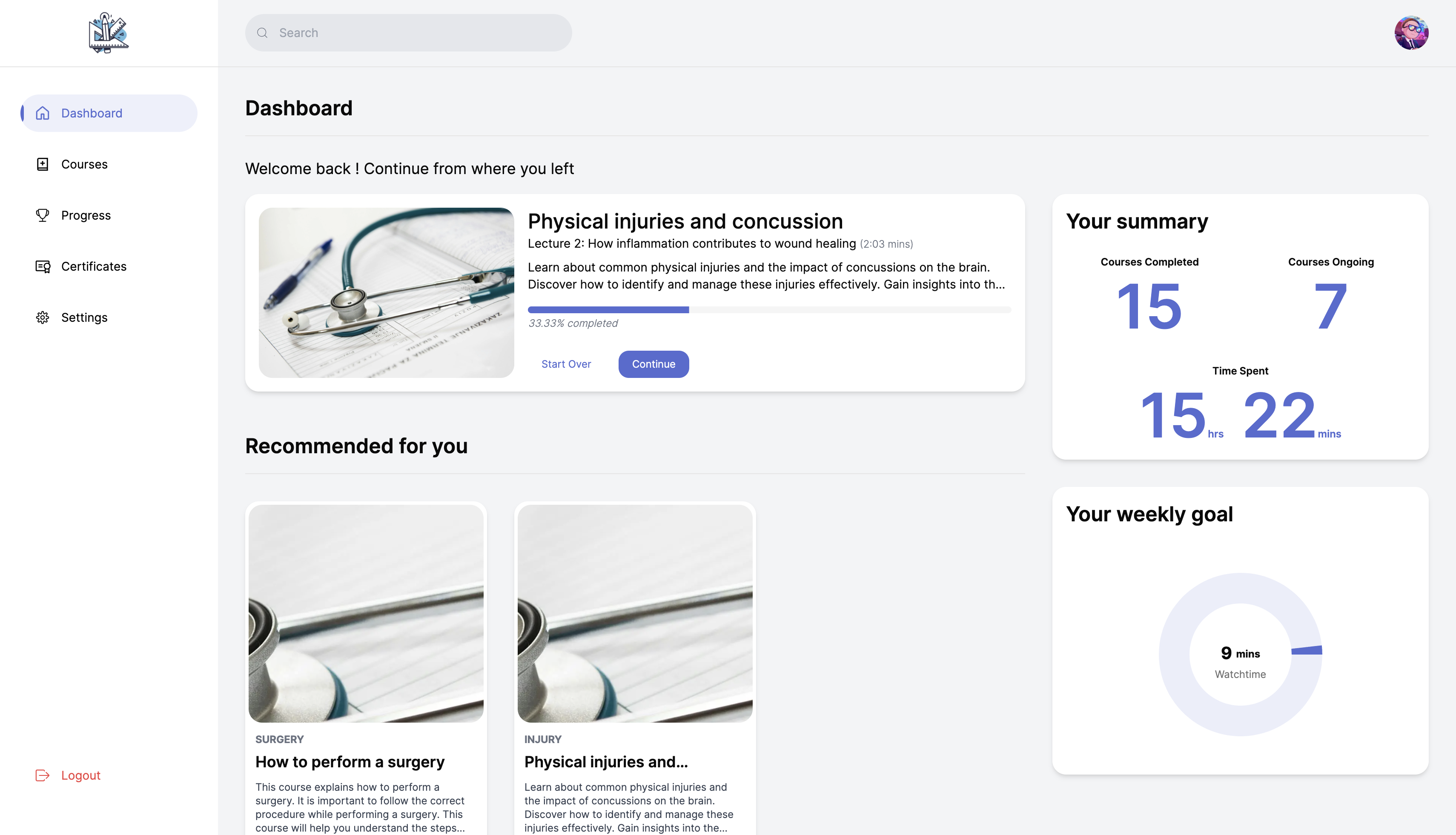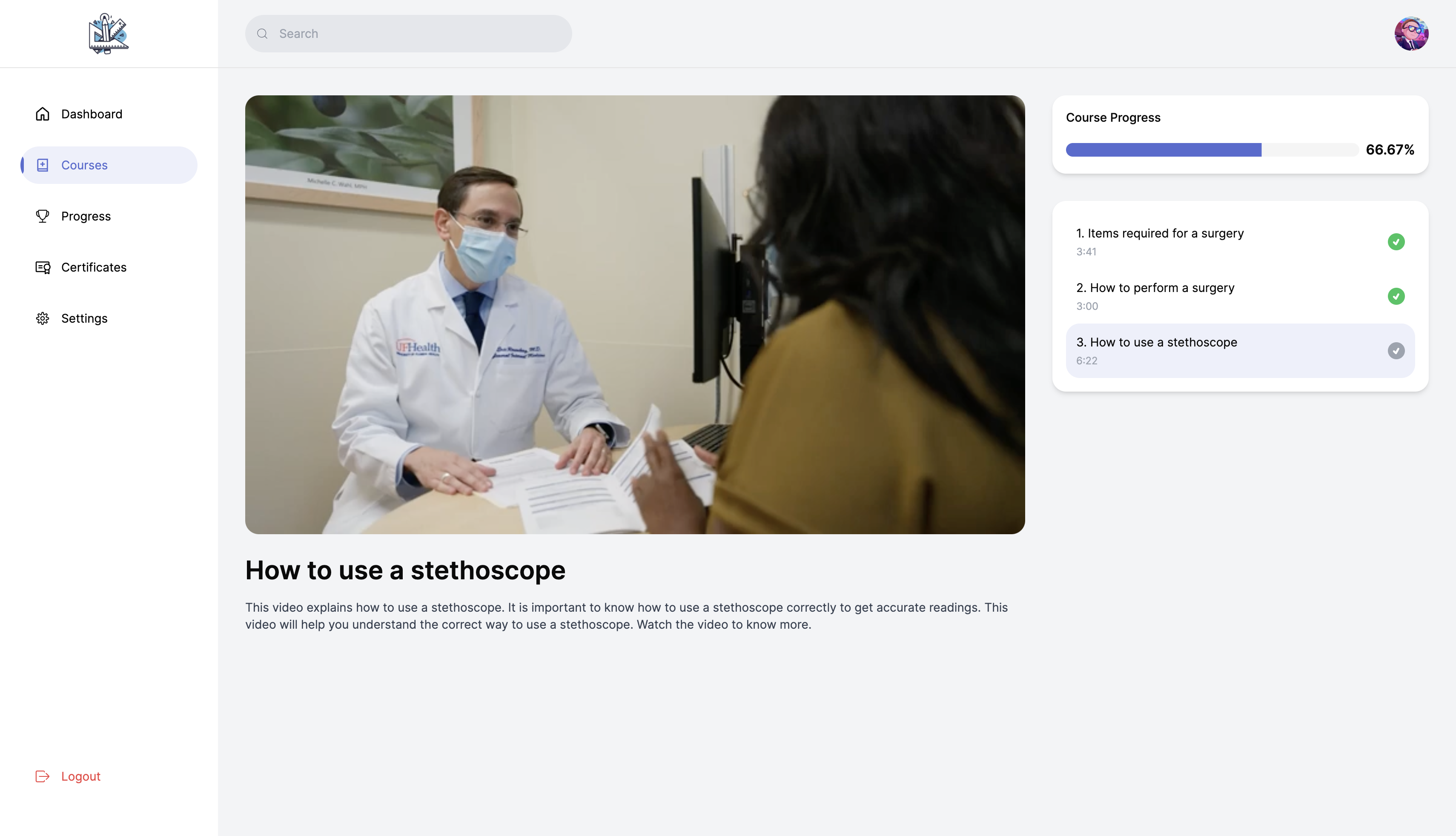 Meducate is an online learning platform for Front Line medical professional, who can enroll in courses and keep themselves up to date with their practices to make sure that they don't go out of touch with their knowledge. It provides a certificate in the end with a validity of certain time period, after which they may have to take the course again to make sure that their knowledge stays in place. It even offers in video quizzes, which tests their knowledge according to what they've learnt. This helps in their hybrid mode of their work, where they can continue working in real life at hospitals, clinics, etc while learning the theoretical part of their course online, and getting certified.