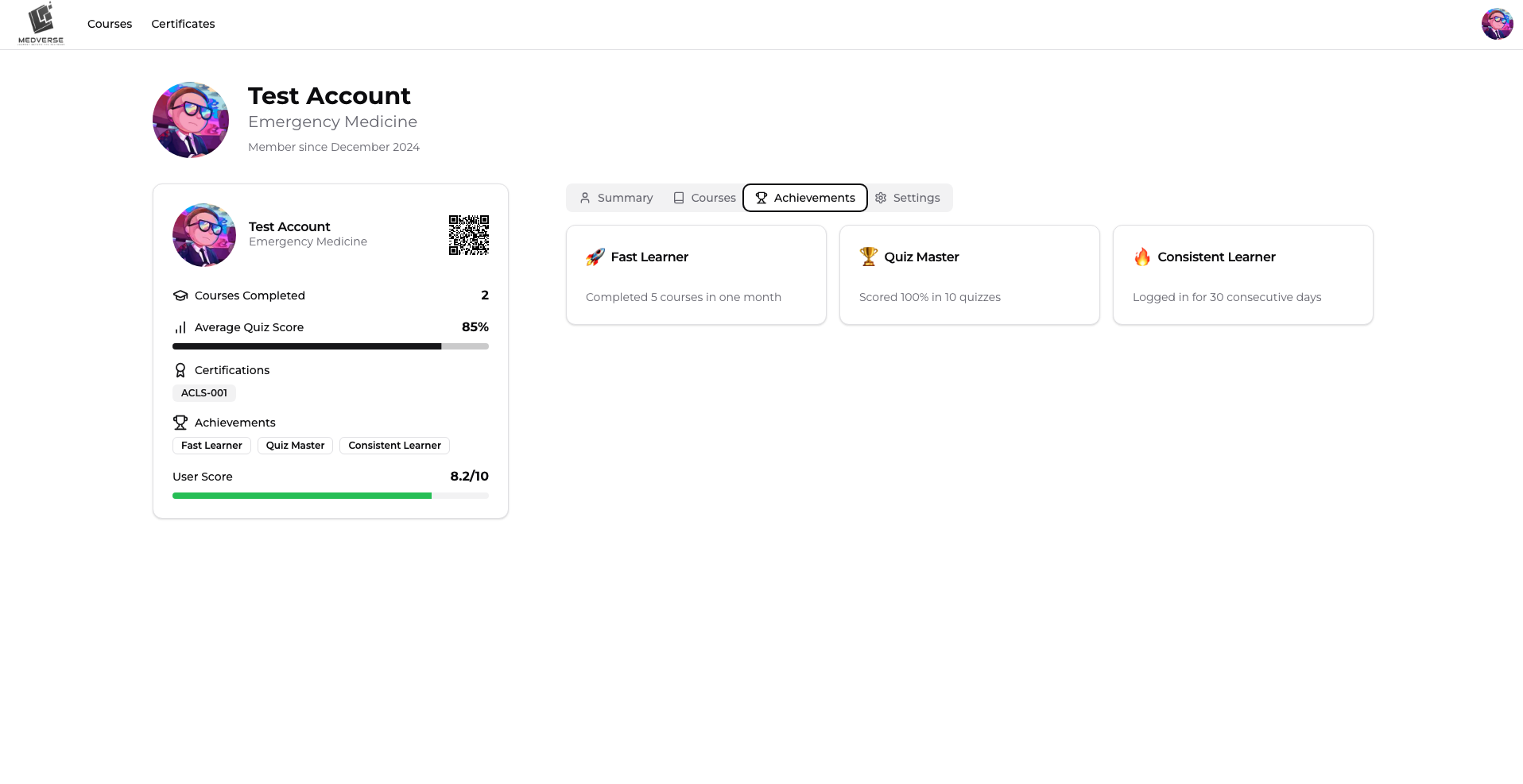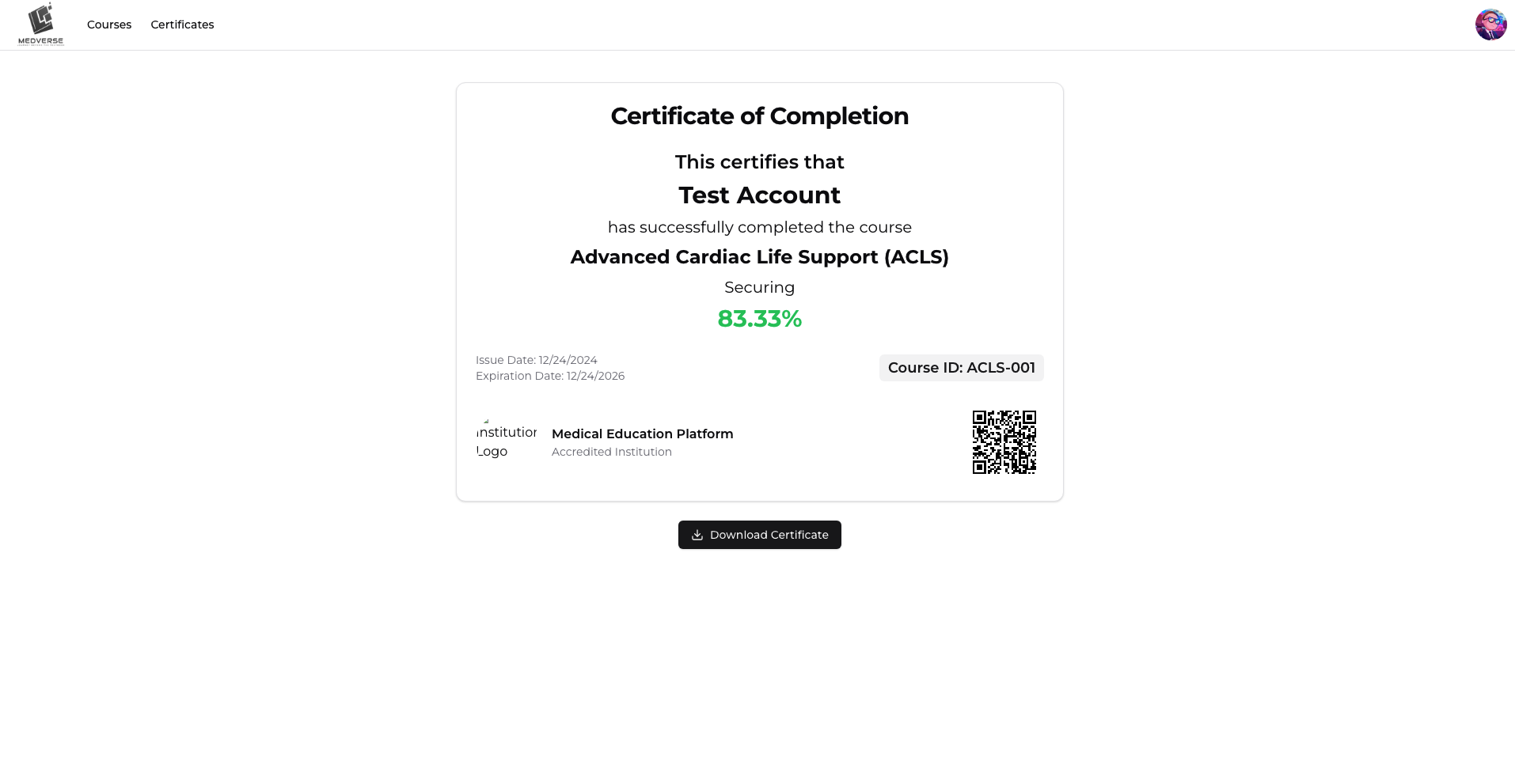 - Certifications: Generates downloadable certificates with QR codes for verification.