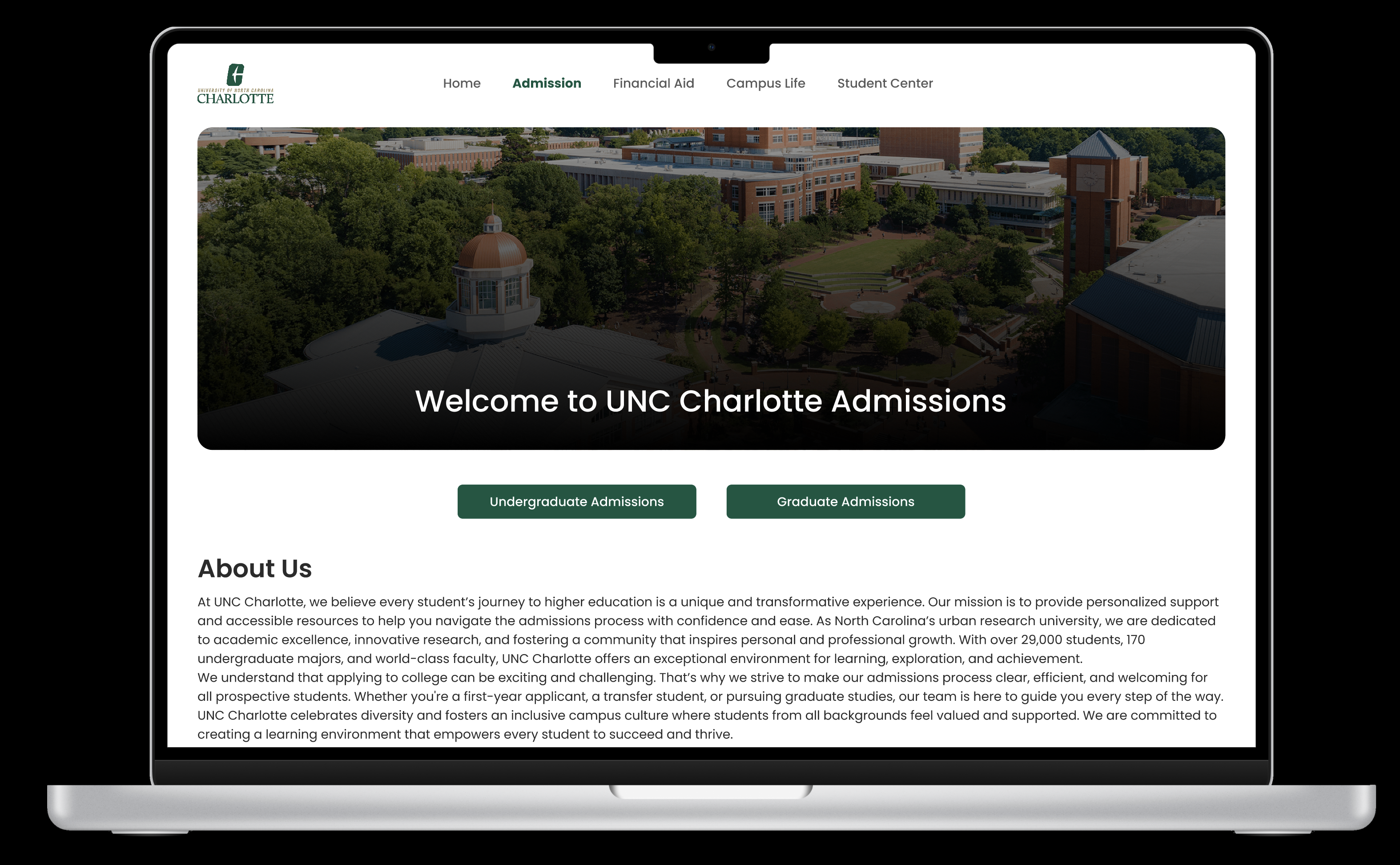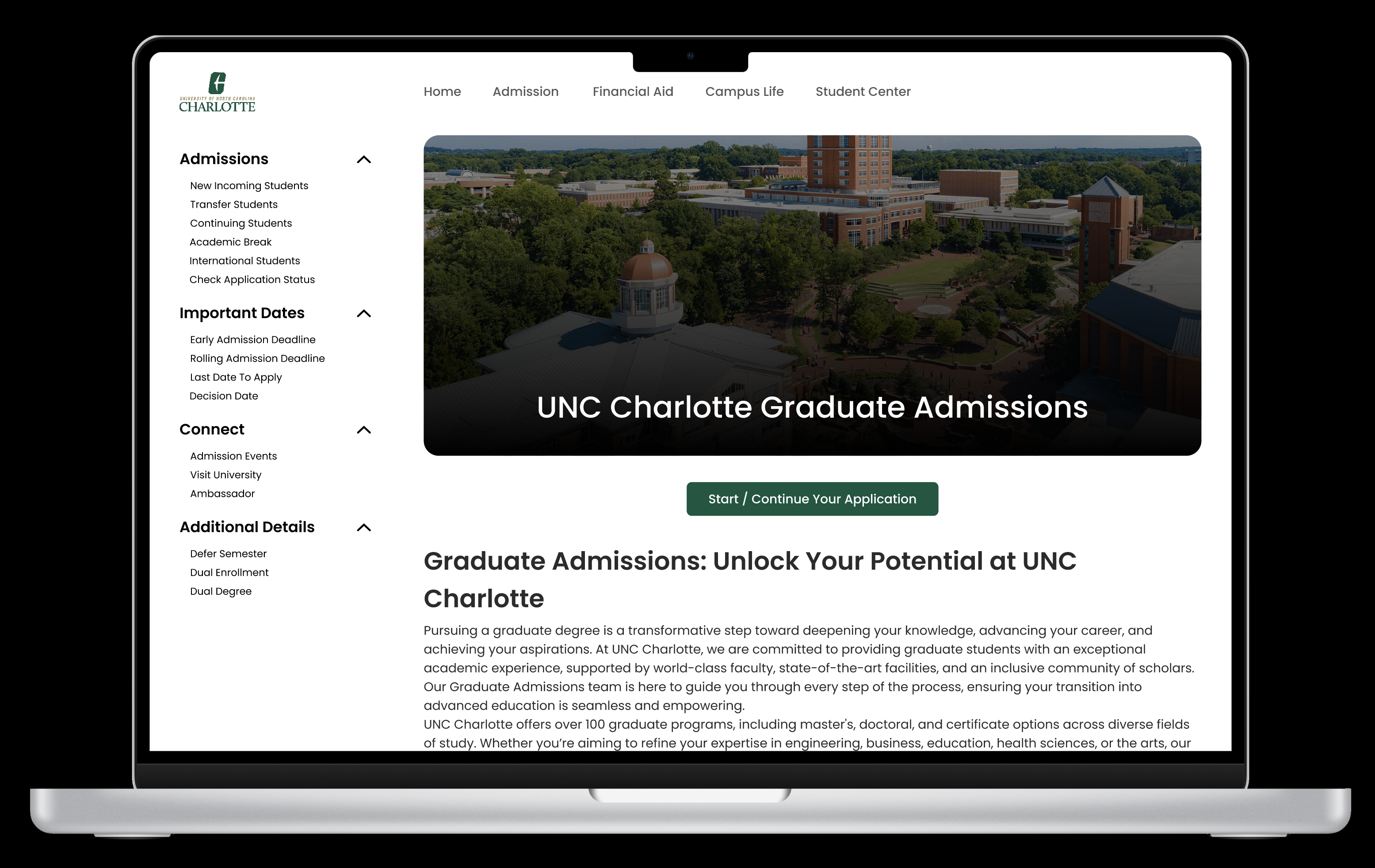 A comprehensive redesign of the University of North Carolina at Charlotte's (UNCC) website for admissions and financial aid. The project aimed to improve the user experience and accessibility of the website, making it easier for prospective students to navigate and find relevant information.